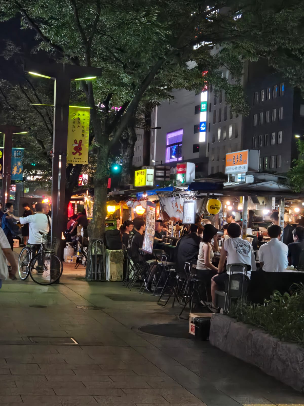 Après une sieste bien méritée, nous sommes repartis à la recherche des Yatai. Petits stands de nourriture en plein air qui apparaissent à la nuit tombée. Présents dans tout le Japon après la seconde guerre mondiale, ils ont été interdit par le gouvernement excepté à Fukuoka car ils se sont constitués en association. Une ambiance intimiste et populaire.