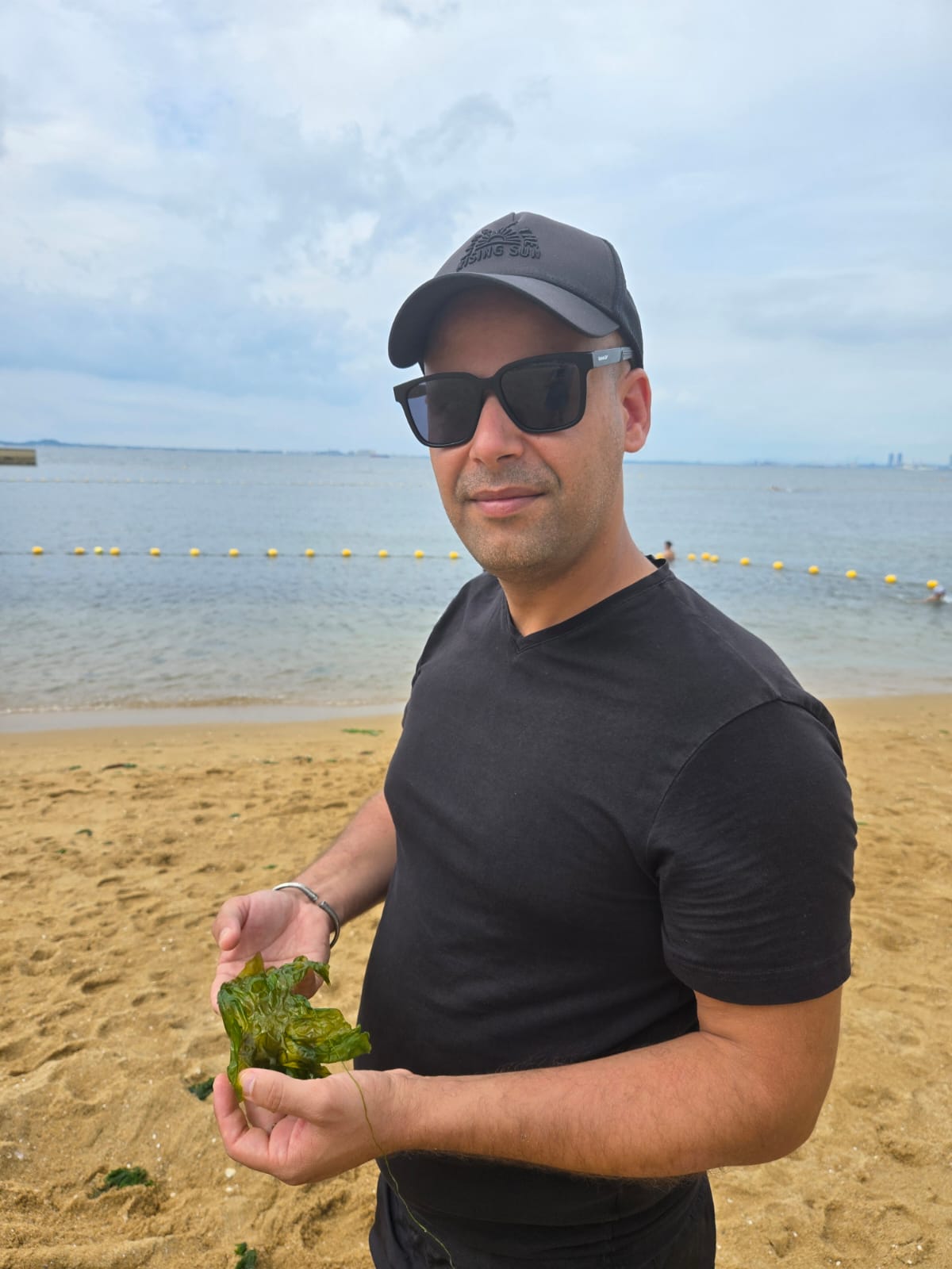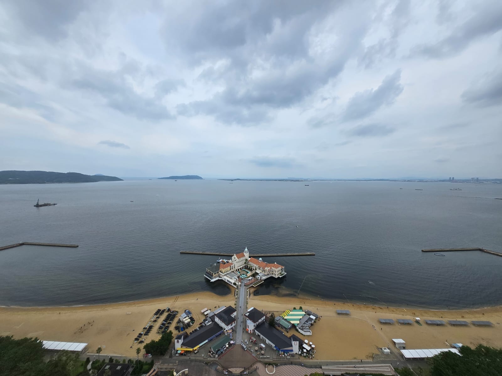 Avant de redescendre, vue sur le ponton Marizon et sur la plage artificielle de Momochihama qui date de 1989.